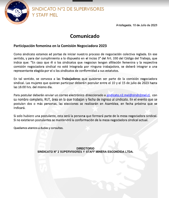 Como sindicato estamos ad portas de iniciar nuestro proceso de negociación colectiva reglada. En ese sentido, y para dar cumplimiento a lo dispuesto en el inciso 3° del Art. 330 del Código del Trabajo, que indica que: “En caso que él o los sindicatos que negocien tengan afiliación femenina y la respectiva comisión negociadora sindical no esté integrada por ninguna trabajadora, se deberá integrar a una representante elegida por el o los sindicatos de conformidad a sus estatutos.