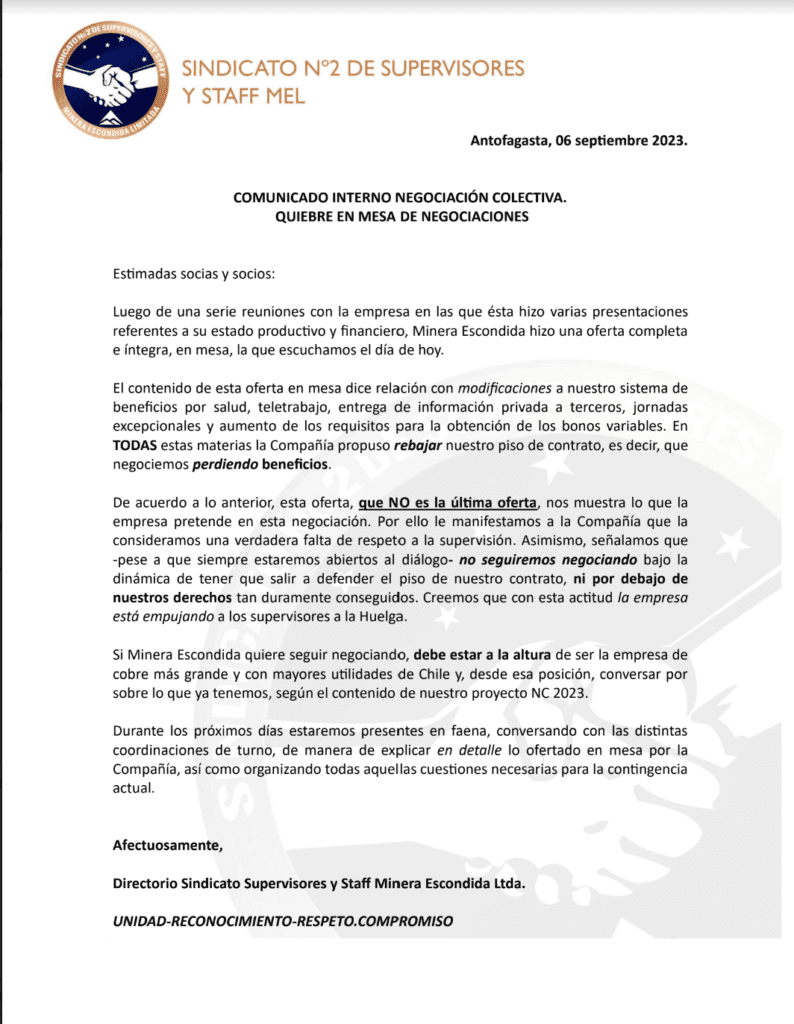 Si Minera Escondida quiere seguir negociando, debe estar a la altura de ser la empresa de cobre más grande y con mayores utilidades de Chile y, desde esa posición, conversar por sobre lo que ya tenemos, según el contenido de nuestro proyecto NC 2023.