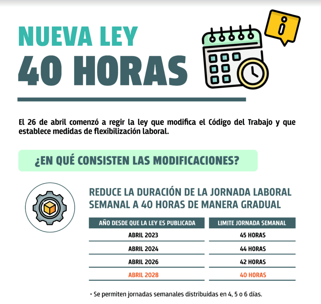Estimadas(os) Socias(os), en el marco de la nueva ley de 40 horas semanales, adjuntamos archivo con información referente a esta modificación en el código del trabajo.