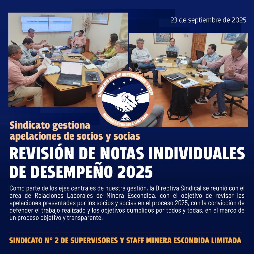 Como parte de los ejes centrales de nuestra gestión, la Directiva Sindical se reunió con el área de Relaciones Laborales de Minera Escondida, con el objetivo de revisar las apelaciones presentadas por los socios y socias en el proceso 2025, con la convicción de defender el trabajo realizado y los objetivos cumplidos por todos y todas, en el marco de un proceso objetivo y transparente.